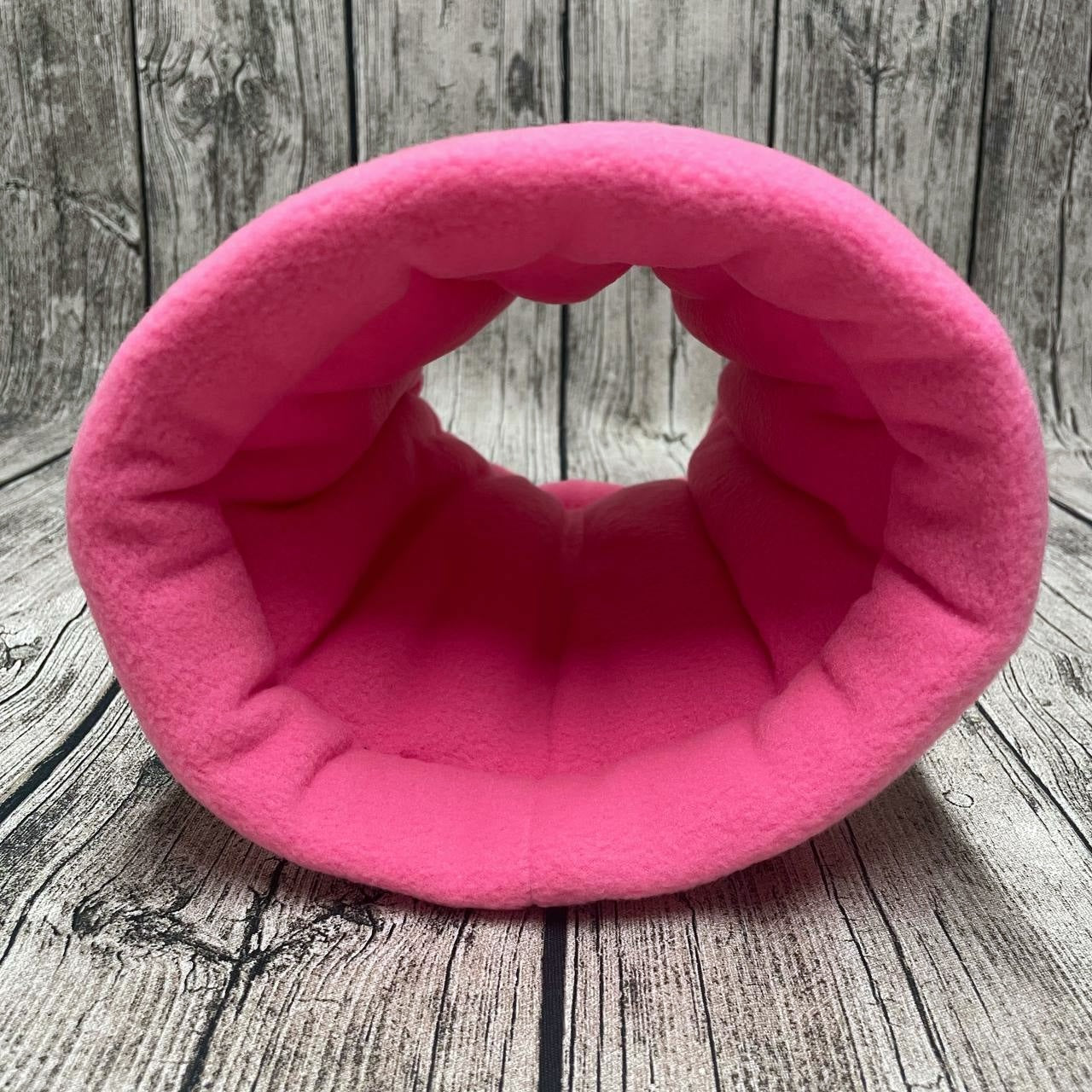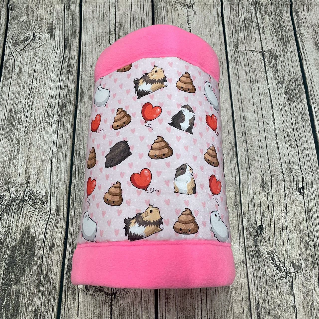 Eine Kuschelrolle mit einem Meerschweinchen-, Herz- und Kackhaufen-Muster auf rosa und innen mit Fleece in neonpink zum einkuscheln. Sie ist zwischen den Schichten innen mit Volumenvlies gefüllt. Die Kuschelrolle ist ca. 33 cm lang und hat einen inneren Durchmesser von ca. 16 cm.