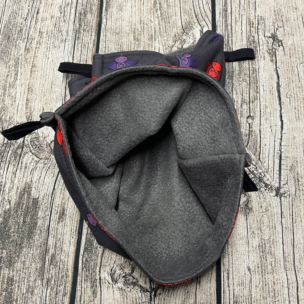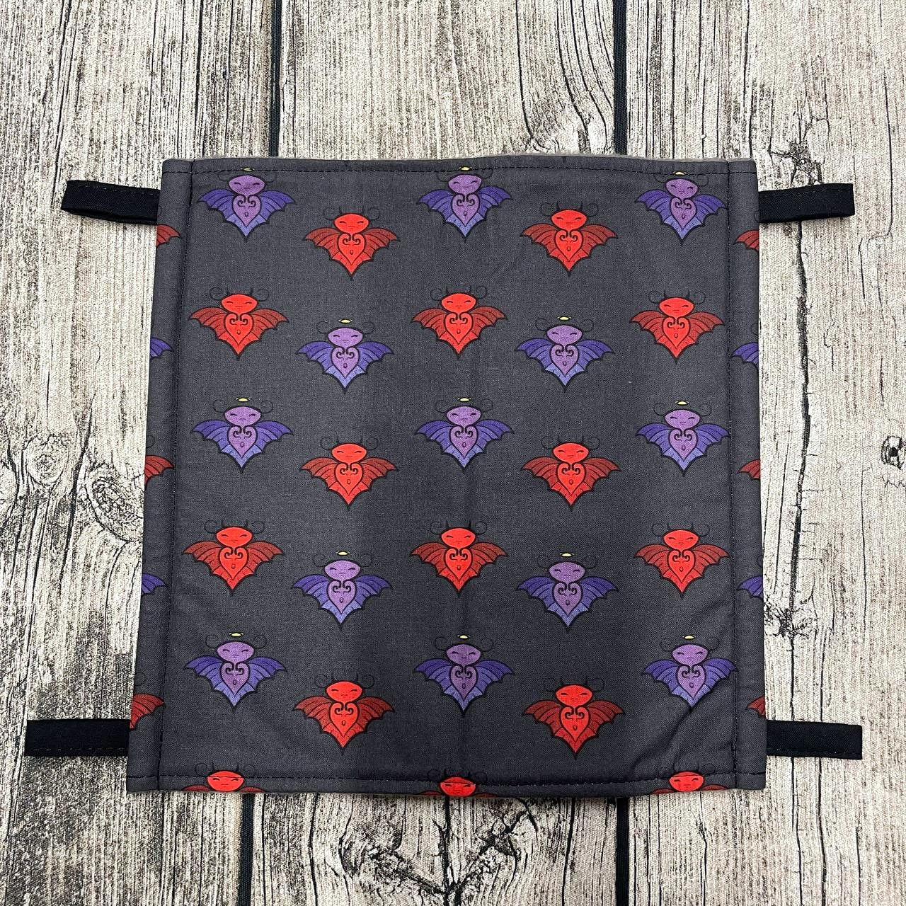 Eine doppelstöckige Durchhängematte für Nager und andere Kleintiere ca. 24,5 cm x 24,5 cm mit einem Muster mit Fledermausengel und Fledermausteufel, von mir selbst gezeichnet. Innen mit Fleece in grau zum einkuscheln.