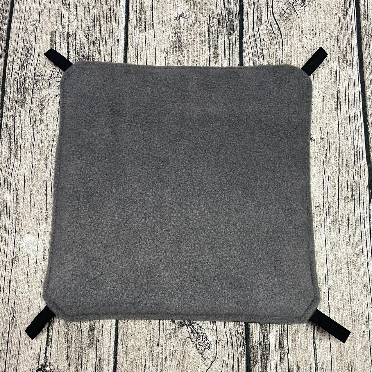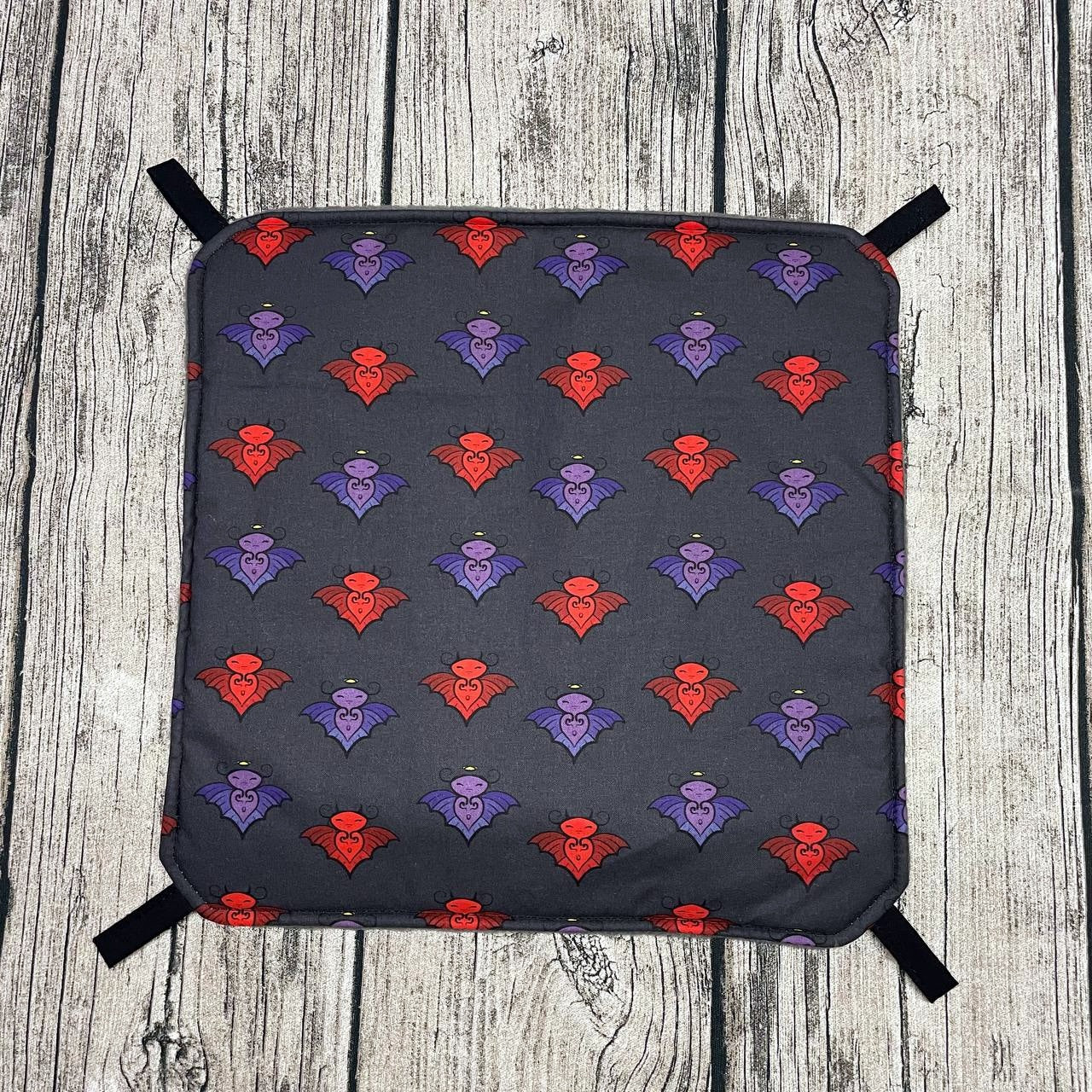 Eine Hängematte für Nager und andere Kleintiere ca. 29,5 cm x 29,5 cm mit einem Muster mit Fledermausengel und Fledermausteufel, von mir selbst gezeichnet. Die Rückseite bzw. die Kuschelseite ist aus Fleece in grau.