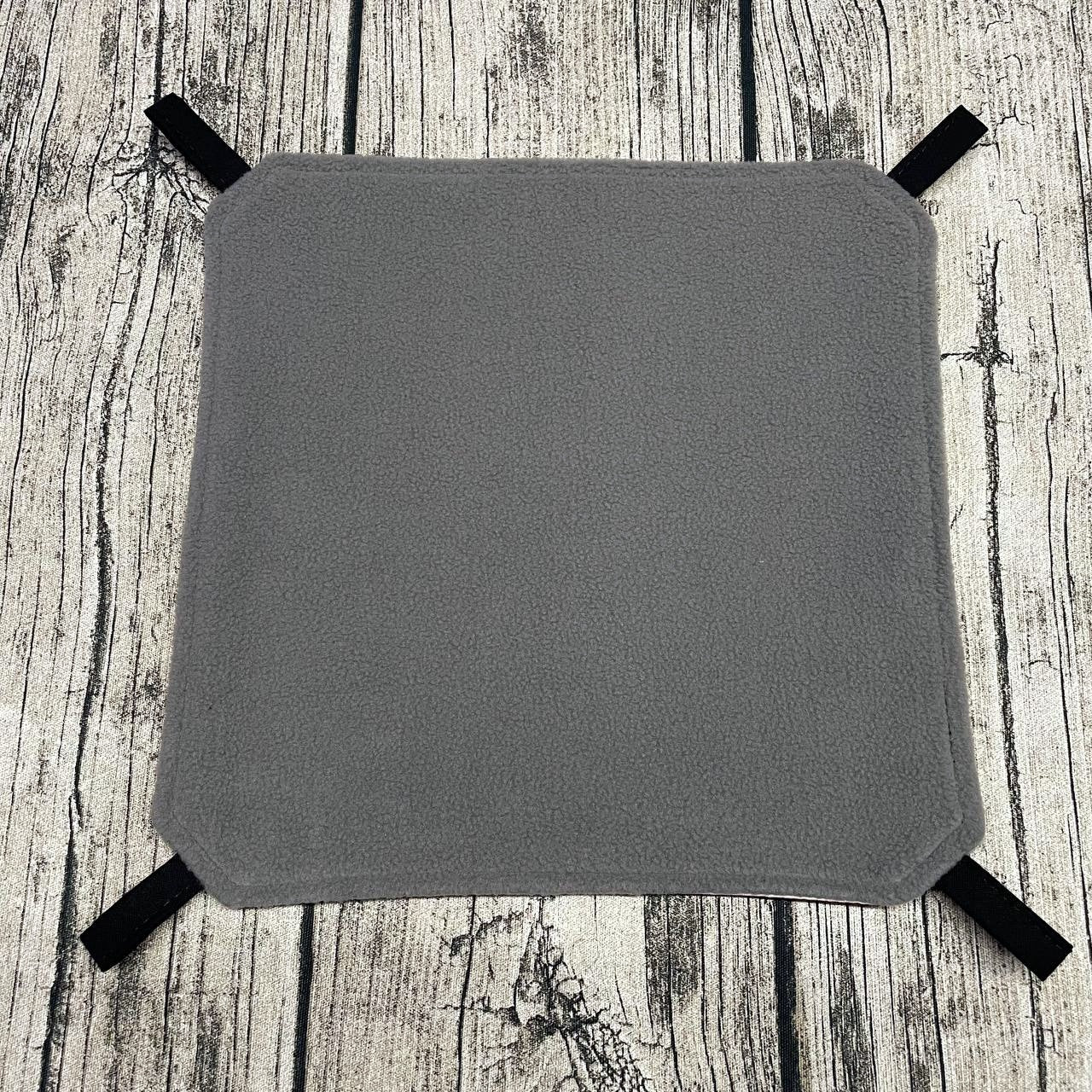 Eine Hängematte für Nager und andere Kleintiere ca. 24,5 cm x 24,5 cm mit einem Mops-Muster und Fleece in grau.