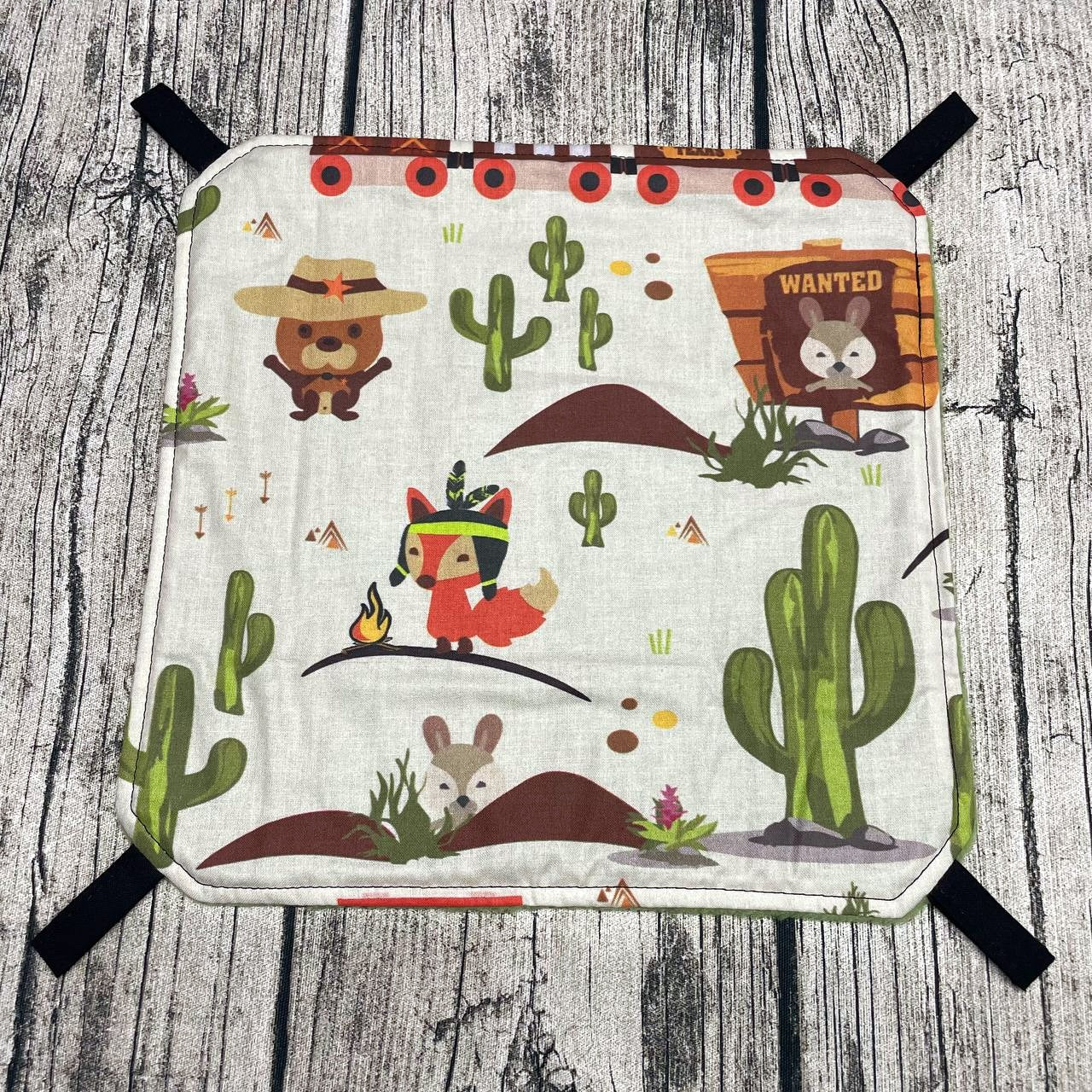 Eine Hängematte für Nager und andere Kleintiere ca. 24,5 cm x 24,5 cm mit einem Wilder Westen Muster und Fleece in lindgrün.