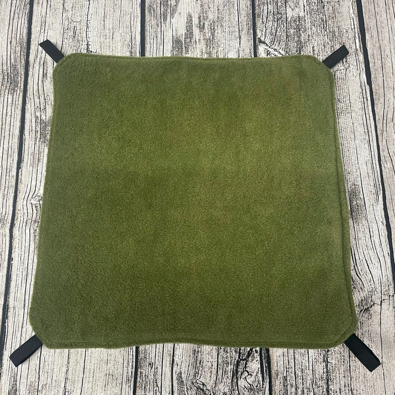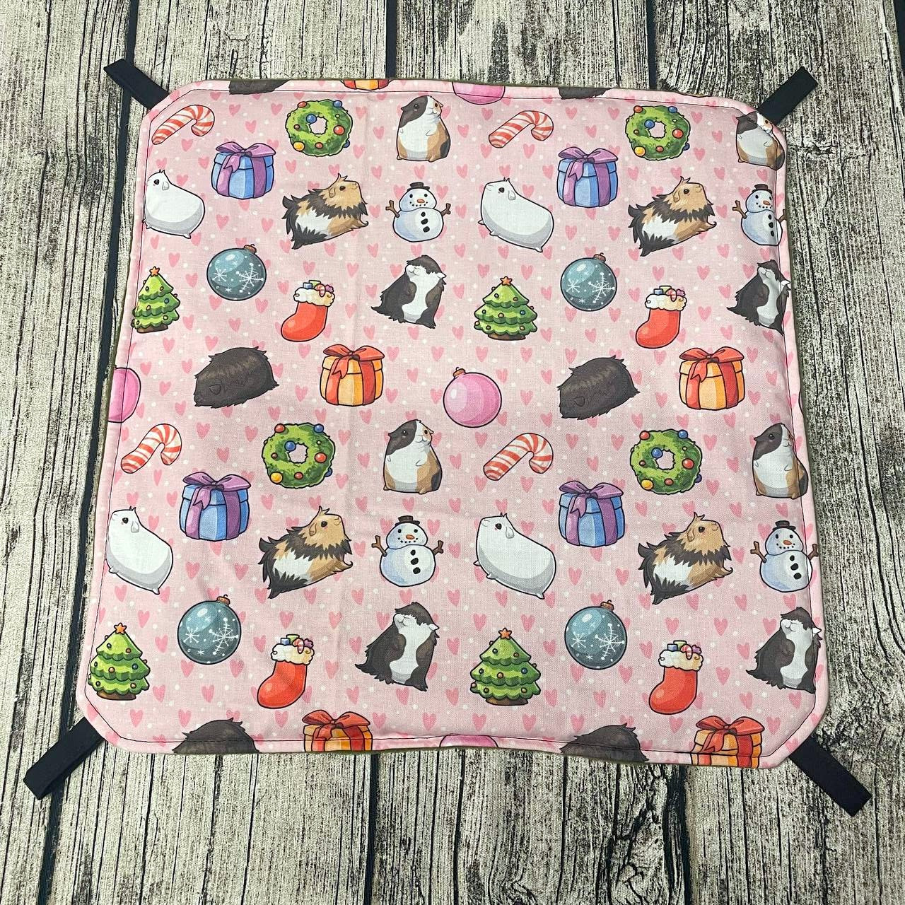 Eine Hängematte für Nager und andere Kleintiere ca. 35 cm x 35 cm mit einem Meerschweinchen-Weihnachts-Muster und Fleece in moosgrün. Diese Hängematte ist innen mit 10mm dickem Volumenvlies gefüllt und somit noch komfortabler und weicher.