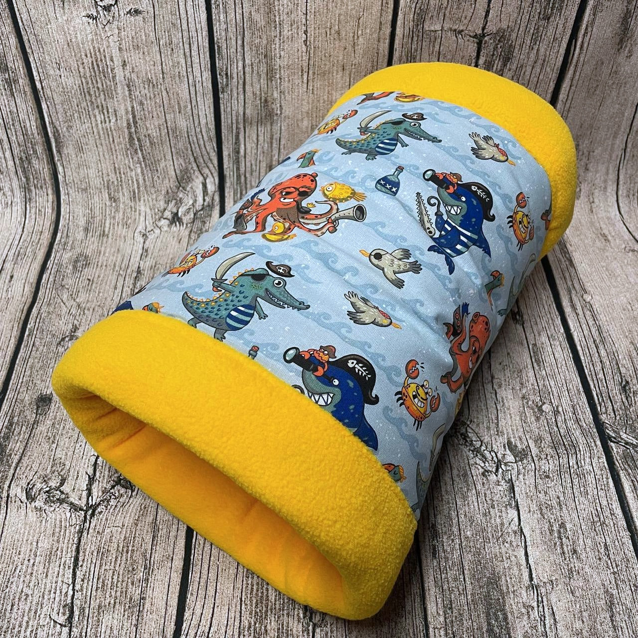 Eine Kuschelrolle mit einem Meerestierpiraten-Muster und innen mit Fleece in gelborange zum einkuscheln. Sie ist zwischen den Schichten innen mit Volumenvlies gefüllt. Die Kuschelrolle ist ca. 33 cm lang und hat einen inneren Durchmesser von ca. 16 cm.